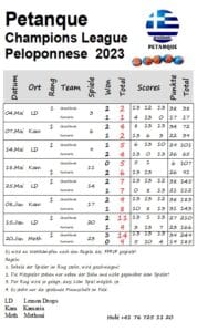 Wettkämpfe finden von Mittags bis abends spät statt. Es gibt in der Nähe noch keine benachbarten Clubs gegen die man antreten kann. Wetttkämpfe werden in der anwesenden Teilnehmern ausgetragen. Wir spielen zu 90 % in der Nähe von Finikounda bei der Lemon Drops Beach Bar und am LOUTSA BEACH direkt am Meer. Die Spieler können zu Fuss auf die Plätze gehen. Es gibt immer Drinks und leichtes Essen!
